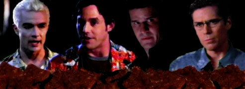 "This bloody well sucks," Spike grumbled to himself in an embarrassing hybrid of Queen's English and Xanderspeak. He groaned the minute the last word exited his mouth, but overall, it was a fairly accurate assessment of his current position. In fact, on Spike's list of favorite positions, 'Locked In A Stuffy Metal Box' was somewhere down below 'Missionary' and nowhere near any of the really entertaining ones that he'd barely started trying out on Xander. 'Locked In A Stuffy Metal Box With Xander' might actually have potential, but since Xander was up front driving the stuffy metal box and the presumably cool convertible to which it was attached, that wasn't an option. So it was dark and hot and boring, and the carbon monoxide seeping back up from the exhaust pipe was giving Spike a headache, and there was nobody in here to rub up against to make the whole experience at least bearable. "Oi! Don't suppose you'd like to turn on the AC back here?" he shouted over the growling of the engine. Xander's muffled voice came back to him, with Cordelia's snarky laughter in the background. "It's a 57 Chevy, Spike. It doesn't come with freon. And even if it did, they wouldn't air condition the trunk." Sure, use logic to splat his innocent, heartfelt pleas of discomfort. "Bite me, Harris." "Same to you, but... Oops. No. Guess not, huh." Xander was having entirely too much fun with this 'Spike is just a brainless twit I can't shake off' routine. Didn't help that their reluctant hostess was loving every minute of it. She'd apparently grilled Xander last night while they were driving the bespectacled hyphenated bloke --who reminded Spike uncomfortably of his mortal self-- home. Asked Xander why he was 'shacking up with the undead' -- and somehow Spike's glib-talking lover had managed to convince her that they were living some sort of musical-comedy buddy flick. Harris and Bloody, now starring in 'The Road to Hell'. And guess who gets to play the useless git with no sense of humor? Dammit, the two of us need to adopt a straight-man, or I'll end up looking as brainless as Angelus. "Well, then, couldn't you at least put on another tape besides that Nerf Herder swill? Stuff makes my fangs ache." "And what does Spike like to listen to? Billy Idol's Greatest Flops?" came the acerbic reply from Cordelia. There was silence except for the music, and then she said slowly, as if reading, "Pistol Whipped? Sex Pistols Live? Aren't they like, deader than you?" "Well, at least you've heard of 'em. Goes you one better than Harmony." His thankfully-ex had asked sincerely if the name had something to do with whips and chains and 'all that other kinky stuff you're not getting me to do, eew, eew, eew.' Three eews. He'd counted. More indie-rock-filled silence, and then murmuring from Xander that Spike couldn't make out, and then the sound of Cordelia laughing. And laughing. And laughing. "Harmony?" she choked out, and then more laughter. "Harmony Kendall ? Is a vampire?" Whisper, murmur, wait for it, wait for it... "And Spike dated her?" And more cracking up at the expense of the poor trapped vampire who'd never done anything to deserve such treatment. Well, nothing much, anyway. Alright, he'd done plenty, but she was supposed to be one of the good guys, dammit! Bloody hell. He should've let her lick the other bowl after all. As the road bumped along beneath him and he tried to ignore the headache that was just getting worse every time Xander hit a chuckhole, Spike let his mind drift back to earlier that morning. Fun with chocolate. Cooking With Blood, volume three. Subtitled 'Never Let A Vampire Experiment In Your Kitchen.' ***** "Yumm... it's Xander-flavored..." Spike sidled up to Xander and whispered in his ear, after pouring half a bag of O Positive into one of two identical bowls of brownie mix. Cordelia was taking a shower, so the whispering wasn't really necessary, but it gave him a perfect opportunity to stick his tongue in Xander's ear. Waving a chocolate-and-blood covered finger in front of Xander's face, Spike was a little annoyed to discover that Xander didn't make eew-face at him, just shrugged. "I'm so glad to know I taste like pig's blood." "Cow," Spike corrected him, sulking a bit that his attempt to gross Xander out hadn't succeeded. "Angel actually put out the dosh for the expensive stuff." "And why use your own when you can steal from the 'rents?" Xander guessed correctly. "Well, I guess I can't get too righteous about that one, unless I want to start paying for the Cartoon Network." Spike licked his own finger, since Xander didn't seem inclined to do it for him, and went back to the table to beat the mixes a little more, letting Xander alone to continue his own advanced culinary experiment-- toaster waffles. On his way back from putting his creations into the oven, though, Spike took the obvious opportunity offered by Xander's rapt attention to the oh-so-exciting toaster. Putting one arm around Xander's waist, he carefully slipped his other hand down the front of his lover's cargo pants. Xander squirmed, but didn't pull away, as Spike started doing things there that shouldn't be done in somebody else's kitchen if you were a good little vampire. Luckily he wasn't. A stroke across quickening hardness beneath whatever today's cartoon boxers were, and Xander moaned lightly. At which point there was a tinkle and a crash, and a half-gallon container of orange juice was splattered colorfully all over the floor. They jumped guiltily apart, Xander almost slipping in the puddle of Florida sunshine, sans vampire-killing side effects. Not that Spike was all that worried about Casper the friendly invisible ghost-- if he was going to grass on them to the landlady, he'd have done it last night -- but the noise was likely to attract other attention, and it did, within seconds. Cordelia came running out of the bathroom wrapped in a towel, long brown hair soaking wet. Spike ogled her unashamedly, unlike Xander, who was tryi