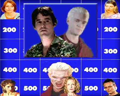 Thank you… Spike muttered to the demonic animal in control of him. Don't suppose you'd get the hell down back where you belong and let me have the wheel again, eh? Grrr. No, apparently not. "Twenty minutes, if we're lucky," Xander announced, hanging up the phone and returning to his seat. "So how does this thing work?" Tara rose from the floor and dragged a whiteboard from where it was leaning against a bookcase, setting it up in front of the fireplace. It was covered, like a traditional Jeopardy gameboard, with squares that had point values scrawled on them in what Spike assumed was scented marker. In this case, the squares were light blue construction paper. "I get to be Alex," she said, smiling. "We were gonna let Giles play by himself, since he's the font of all knowledge, and have everybody else pair up, but since S…Spike's here, I guess we've got even teams. You… are playing, right?" she asked Spike, making about the first words she'd ever said directly to him, come to think of it. Unless 'She is a wiz' , defending Red's computer skills in a tense moment, actually counted. Oh, hell. Look at 'er. Another broken one. Just as bloody bruised as the boy. Why, oh why, must I be surrounded by puppy-children! Spike broke eye contact, lest the furious energy that was running his body decided to co-opt his mind again and try digging at the blonde. At least he managed that much control. "Oh, yeah. Team Demon all the way, right, luv?" His body and his demon both grabbed Anya pseudo-playfully and pulled her close to him in a tight hug. More squirming. Xander was watching him, getting more and more upset. He could see it, and what he wanted most was to get up, save the demon-girl for a late-night bitch-out some other time, and drag Xander away somewhere to kiss all that hurt and confusion off his face. Because he's mine, for now, and sod that macho crap. But no such bloody luck. Just the nasty-good feeling of Anya's skin crawling, and a low rumble from his demonic alter-ego. "I'm all yours, Xander," Willow added. "If you want me." And didn't that have the ring of history to it. Yeah, well, me too, witch. If I could manage to swim back up to the surface, anyway. 'So we have Slayer/Watcher-team, Demon-team, and Sunnydale Home-team…" Buffy offered, slipping down from her counter-stool and dragging a chair over to the open area just to the right of Anya's end of the sofa. "And the point of this little bonding-exercise?" Spike sniggered to no one in particular. "Pick each other's brains about demonic lore and history, without there having to be a Big, Bad and Ugly breathing down our necks," Willow replied. "Besides Spike, that is," the Slayer chipped in.