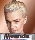 Parking lot of the Food Mart. Dark-haired guy in jeans and Sunnydale Swim Team t-shirt. Arms full of grocery bags. Look left -- no demons. Look right -- no vamps. It's 1:30 in the afternoon, Harris. They don't sell Gems of Amara in the gumball machine next to the exit sign. Spin around -- no Anya following him to rip apart his lame excuses for buying six boxes of Count Chocula, three jars of chocolate peanut butter, and a 24-count Valu-pack of Almond Joy candy bars. Said excuses being: 1. He was planning to make "Count Chocula treats" for the Scoobyriffic research party at Giles' next Tuesday-- a bold-faced lie which resulted in him also having to buy several bags of marshmallows and a tub of butter. But I can't very well tell her that my subconscious is apparently hoping the blood-sucking, chocolate-crunching undead will decide to give me mouth-to-mouth again. Preferably without the blood this time. Oh, I did not just think that. I am losing my mind! 2. He was out of peanut butter-- the shameful truth. 3. Sometimes you feel like a nut, sometimes you don't-- that one had earned him a smile. Okay, the Anya getting his jokes thing was really wiggins-inducing.. Truthfully, junk food, especially chocolate, was his fallback comfort zone. Home life getting a little too nightmarish? Love life or lack thereof tearing him up inside? There was always his safe, supportive, delicious friend, chocolate. And Willow, and once, Jesse. They'd been the Three Musketeers. Chocolate was d'Artagnon! Willow would be so proud of me. See, watching American Movie Classics at 3 a.m. really can increase your cultural literacy. When they'd lost Jesse, when they'd found Buffy, everything changed. Their fab four turned into the fab five. Or fab six. Or fab seven, depending on the day of the week or the phase of the moon. And when I felt like I was on the outside looking in, couldn't do a damn thing to help save the world this week, at least there was good old chocolate. Friends and lovers may come and go, but chocolate is constant. Chocolate is pure and good. Especially this last year, as he began to feel more and more left behind, while the fab however-many seemed to be falling apart. And I'm babbling, thankfully not out loud. Chocolate is pure and good? Now, though, since Adam, they were back in each other's lives. Now they were vowing Scooby togetherness, and no more keeping stupid hurtful secrets. Now chocolate was on the outside lookin' in, and everything was supposed to be fine in Xanderland, except for the whole Anya dumping him thing, which, truthfully, he wasn't all that upset about. Confused, but somehow not surprised, and since their little conversation in Aisle Two, not even all that confused any more. So-- Almond Joy. Lots of it. Why? Because I'm losing my frickin' mind! Chocolate, come home, all is forgiven! I neeeeed you! Spike. Basement. Tight jeans. Count Chocula. Kiss. Huh? And then there was the fact that he'd played the entire experience over in his mind in a delirious film loop all day as he'd stocked groceries. And his entire conversation with Anya had been carried on with "I did not kiss a vampire last night, I did not kiss Spike last night" playing as the background music in his skull. Chocolate, help meeeee! Silence from the chocolate. I'm not gay, right? Not that there's anything wrong with that... I'm cool with good old Larry, may he rest in peace, and believe me, I'm totally in the Willow and Tara groove, but not me, right? Right? Um, chocolate, you're not answering me here.... Except chocolate wasn't really all that pure anymore, was it, since the blonde vampire had pressed his chocolate-coated lips to Xander's chocolate and blood, but I'm trying to forget that, blown Xander's exhausted mind, Xander, mind, he blew your mind, and then smirked his way back to the table to happily crunch his bloody Count Chocula. And a big eeeuww to my mind for dredging up that image, thanks so much... Still, it wasn't chocolate's fault Spike had dragged it into that bizarre little scene. Chocolate would stand by him, Xander was sure of it. Yup, talkin' 'bout the choc like it's a person. Definitely feelin' like a nut at the moment. With that thought, he reached his Uncle Rory's repaired-for-the-moment car, and set the grocery bags on the trunk. Reaching into the all-important one, he ripped open the plastic on the Valu-pack and fished out one of those familiar blue-wrappered bars. Tearing the slick paper away, he slid both milk-chocolate pieces out of their cardboard holder and into his waiting mouth. Prozac for the poor: sweet milk-chocolate, chewy coconut, and those two crunchy almonds waiting in the center of each bar... Oh, yeah. ***** Spike was trapped, bored, and looking for a fight. Unfortunately the only thing he could find to fight with at the moment was Xander's washing machine, and it was winning. Not stupid enough to try washing his own clothes in it again, at least not yet, he'd decided to practice on Xander's. The mixed pile of cast-off and still viable uniforms on the floor, including the one that the boy had thrown at his head last night, provided a nice start. Everything was going swimmingly until the damned buzzer went off, and nothing he did seemed to make a blind bit of difference towards shutting it up. It didn't do this before! What the hell button did I press this time?? "Xander, open the lid and add the fabric softener! If you absolutely have to set the washer on Idiot-Proof, the least you can do is pay attention to the buzzer!" shouted an exasperated female voice from upstairs. Spike lifted the washer's lid, and there was wonderful, holy, or maybe unholy, silence. Ah, thank you, Xander's half-drunk mum. You, I'll consider not killing immediately if I ever get this bloody chip dug out of my skull. The silence was maybe a little too silent, and he didn't particularly want to have the "who are you and what are you doing in my son's room" conversation with Mrs. Bourgeois Suburban Housewif